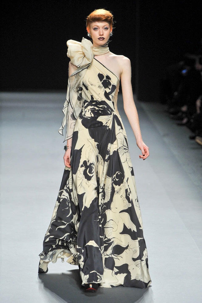 Film noir, a genre of Hollywood films of the 1940s was the inspiration behind this collection and it did not disappoint. Form fitting, figure hugging gowns with strong shoulders and embellished necklines in fabrics that draped the body like liquid metal were shown along side jumpsuits and cocktail dresses that were equally impressive. A color palette of blush pink, brick red, icy blue, black, "Bacall" nude, and metallics complimented the draping and fabrication of each garment.